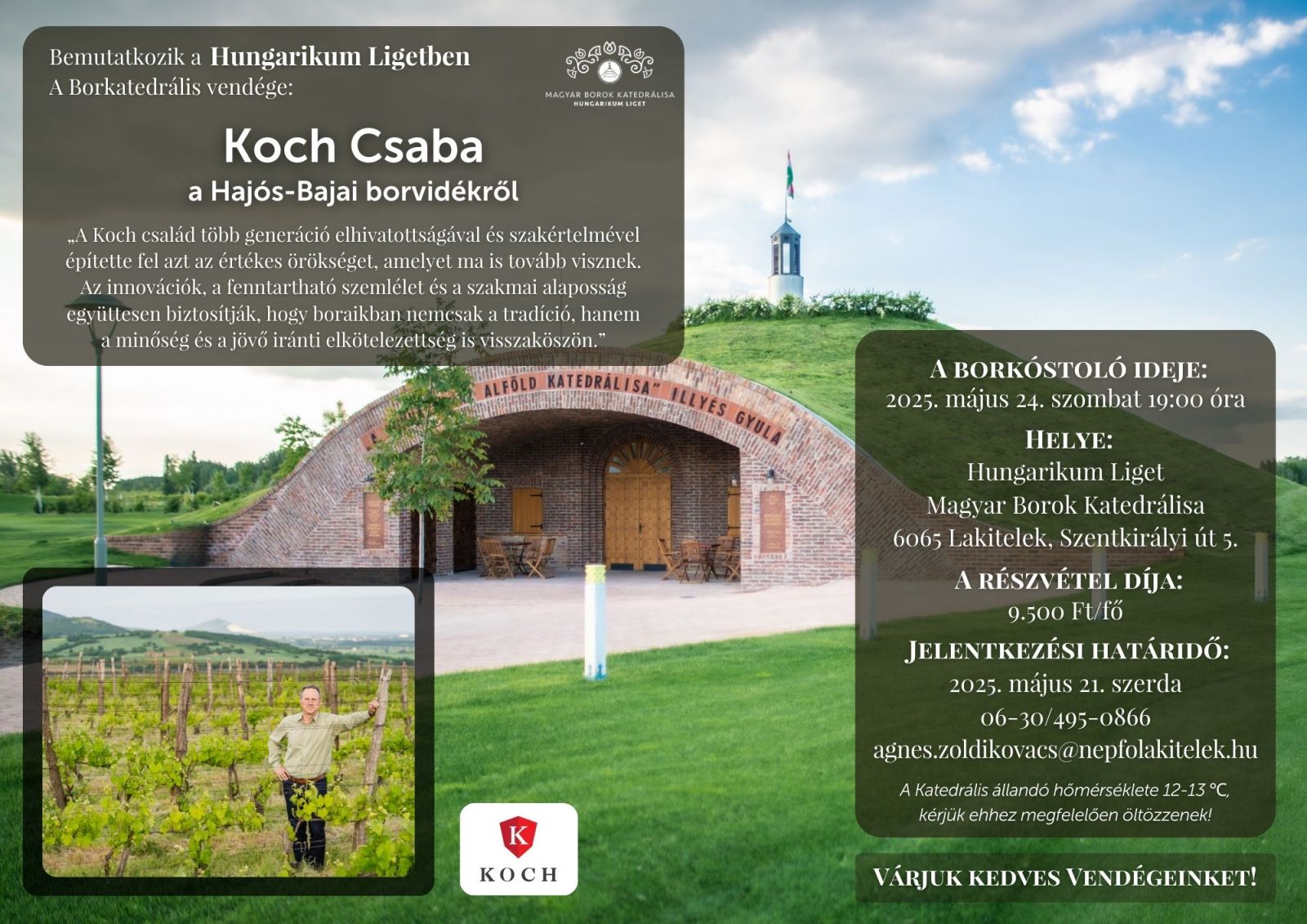 Tisztelettel meghívjuk egy különleges borestre, ahol személyesen is megismerhetik Koch Csaba Hajós-Bajai borász, a magyar borkultúra kiemelkedő alakjának munkásságát és kiváló borait.