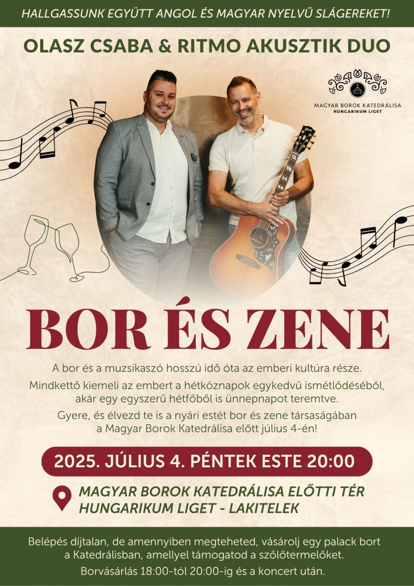 Egy hangulatos koncertre és kellemes borozásra várjuk az érdeklődőket a Magyar Borok Katedrálisa elé, 2025. július 4-én, péntek este.