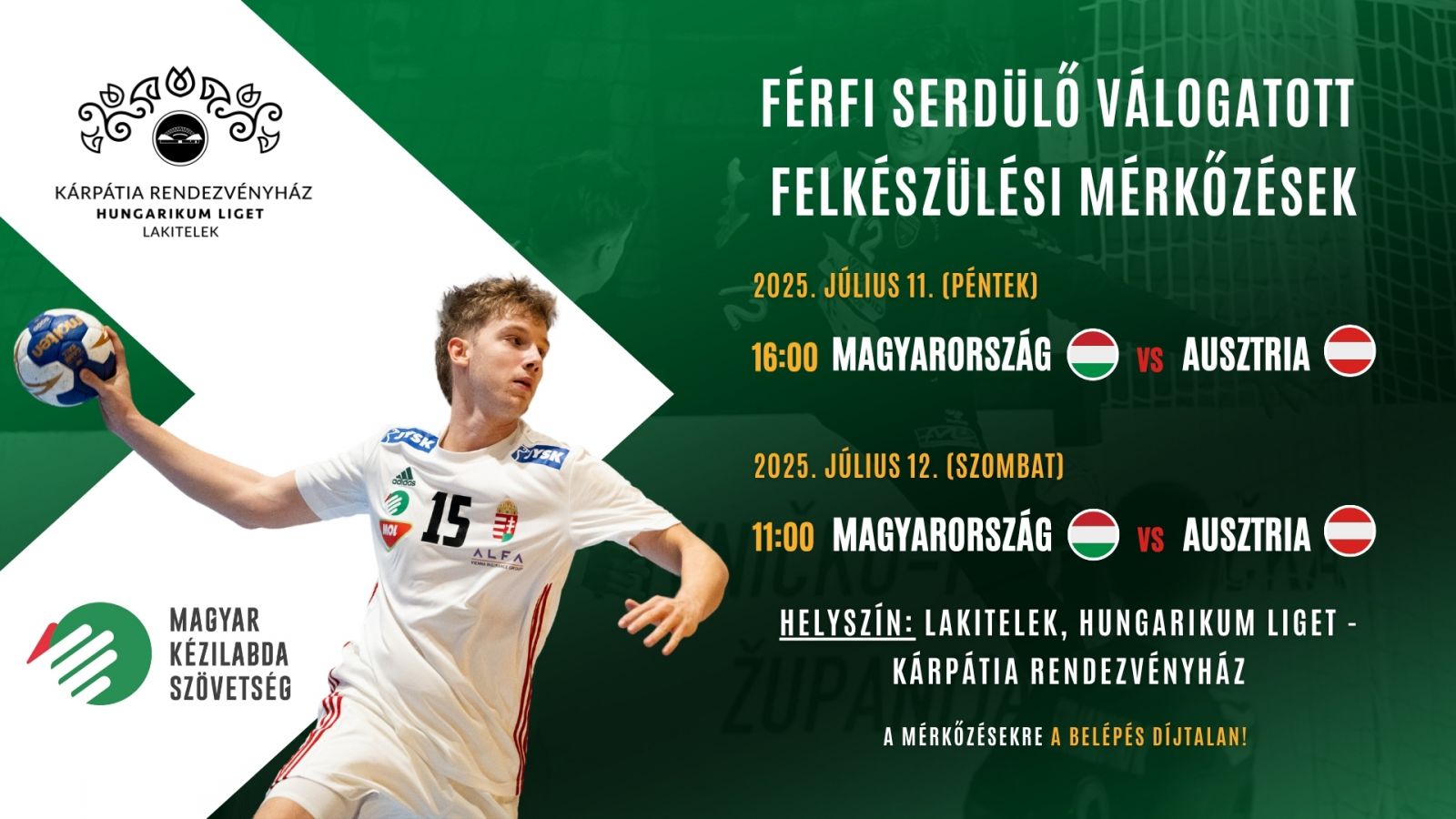 Igazi sportcsemege vár Önökre 2025. július 11-én és 12-én a lakiteleki Hungarikum Liget - Kárpátia Rendezvényházában! Magyarország - Ausztria Férfi serdülő válogatott felkészülési mérkőzések!