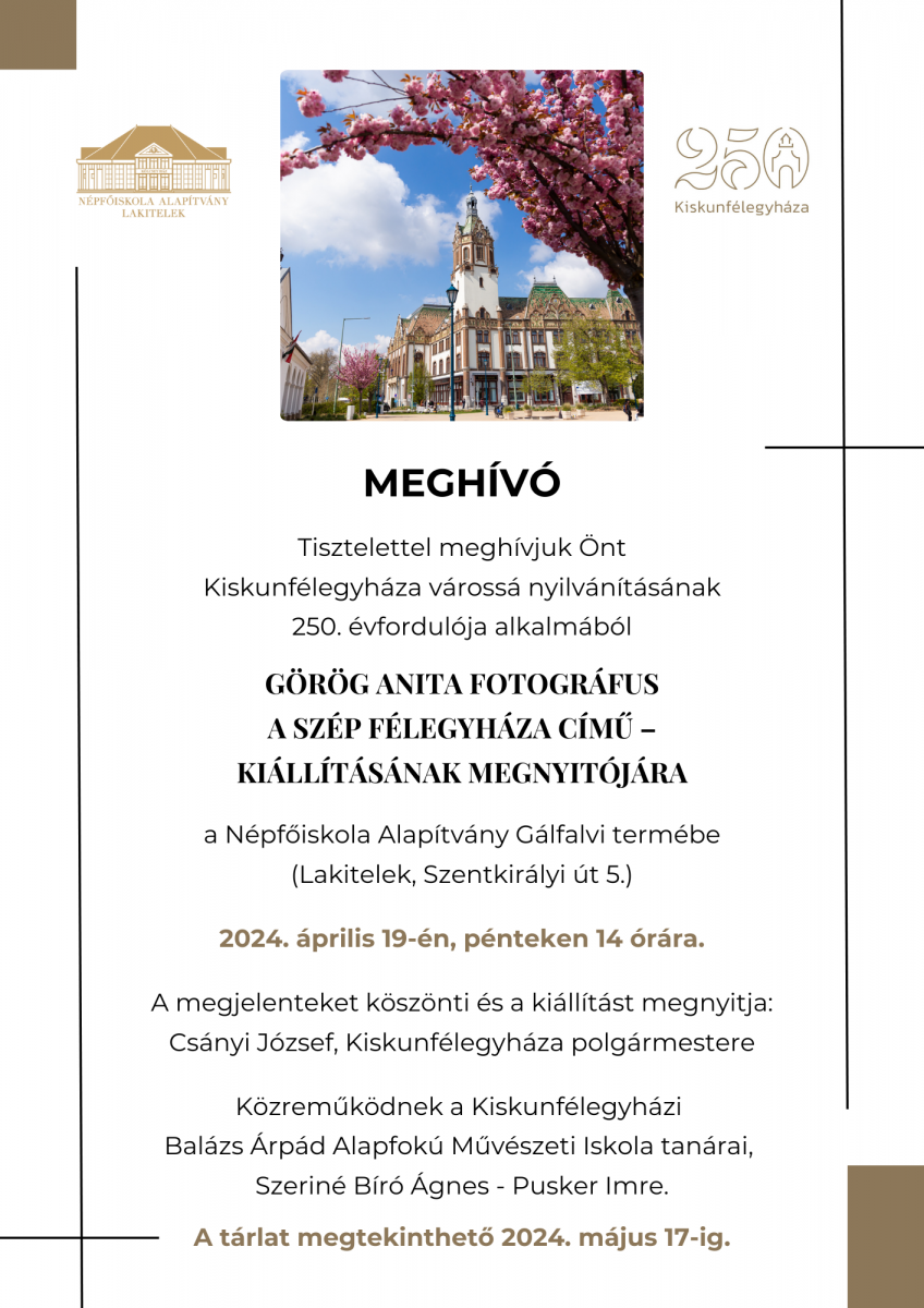 Tisztelettel meghívjuk Önt Kiskunfélegyháza várossá nyilvánításának 250. évfordulója alkalmából készült kiállításra.